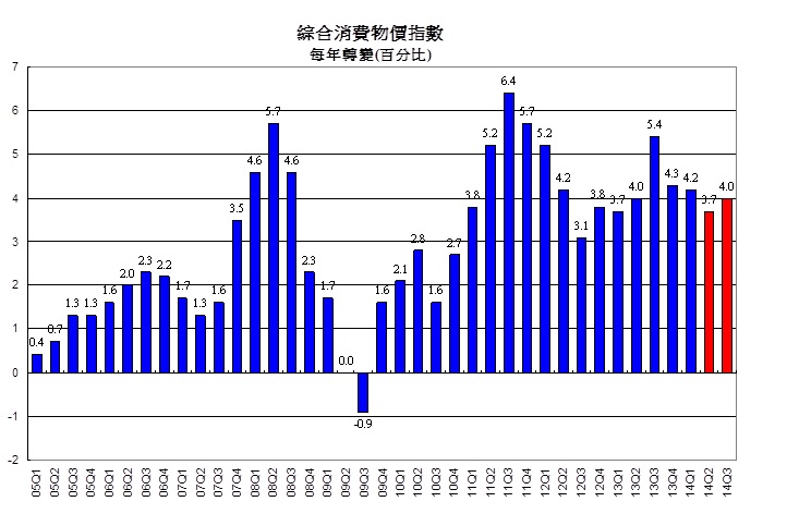 「預料勞動力市場維持相對穩定,失業率在2014年第三季將保持在第二季的3.2%水平。預期通脹在短期內會略為平穩。整體通脹率由第二季的3.7%,增加至第三季的4.0%。」香港大學經濟學首席講師王家富博士補充說。