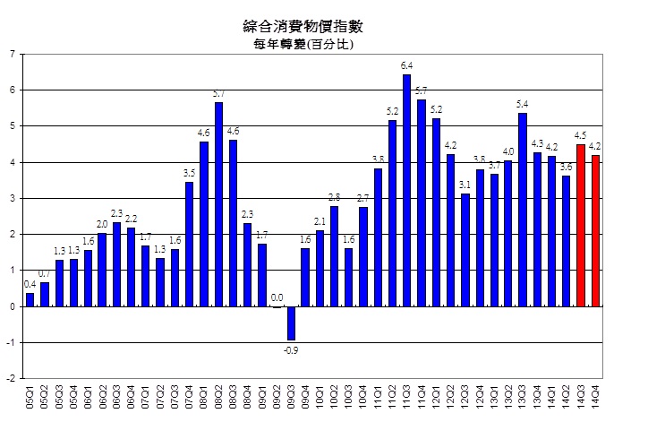 - 以綜合消費物價指數量度,2014年8月一般價格水平上升了3.9%, 2014年第三季整體消費通脹率估計為4.5%。扣除去年政府各項措施(如公屋免租金及電費補貼),通脹率在第三季只有3.3%。預料本季通脹率為4.2%,在扣除差餉寬減措施結束的影響後,同期通脹率為3.4%。預計整體消費通脹率在2014年全年為4.1%,較2013年4.3%略低。