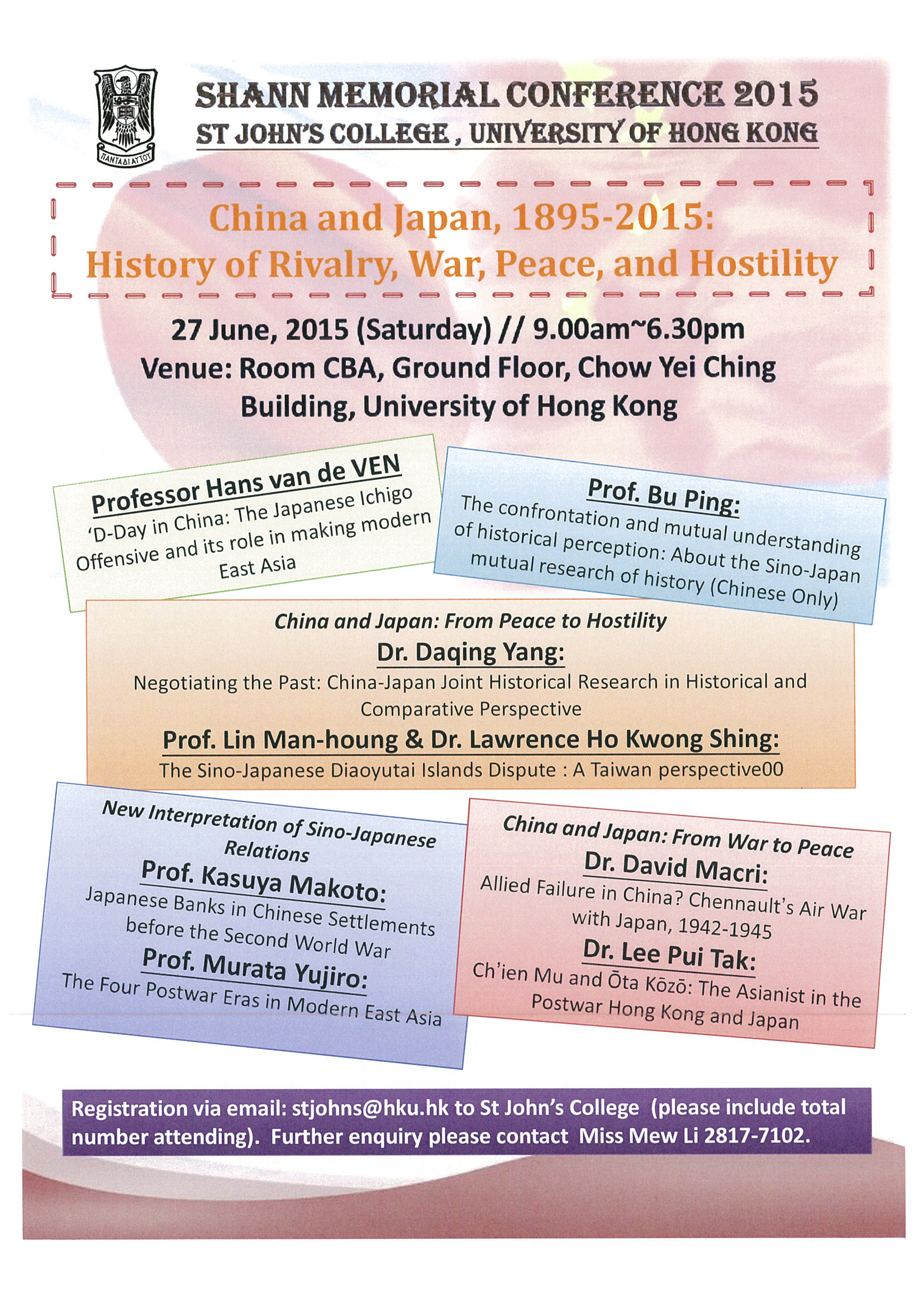 The College of St. John the Evangelist (St. John’s College), the University of Hong Kong, will hold the Shann Memorial Conference 2015, titled “China and Japan, 1895-2015: History of Rivalry, War, Peace and Hostility”, on June 27, 2015 (Saturday).