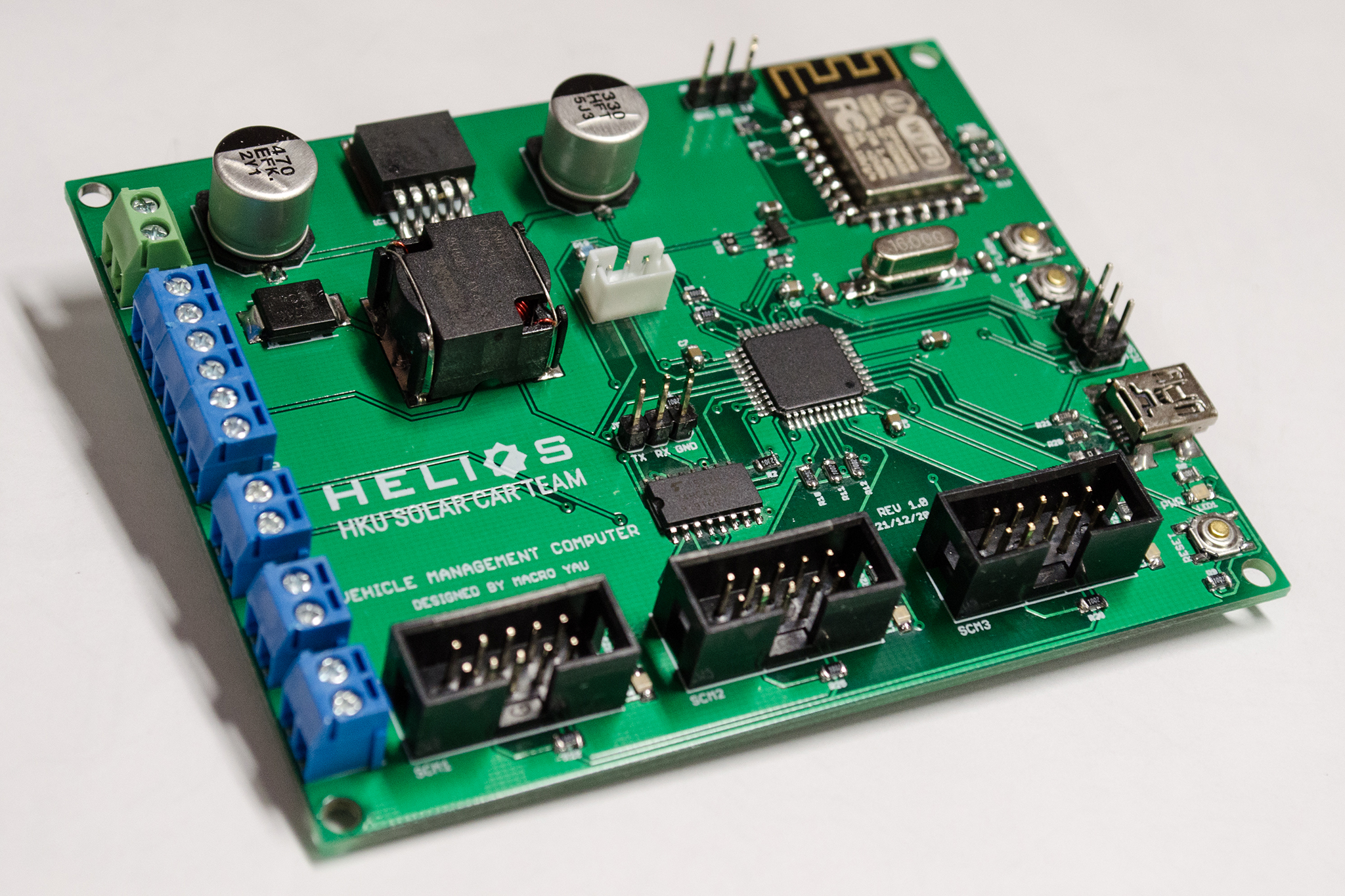 香港大學工程學院學生自行設計的「行車管理電腦」為 Helios 太陽能車之「大腦」。在太陽能車充電及行車時,此電腦會透過車身上的大量感應器監測車輛狀況,保障司機及車輛安全。同時,輕觸式儀表板亦會經此電腦獲取太陽能車之實時數據。