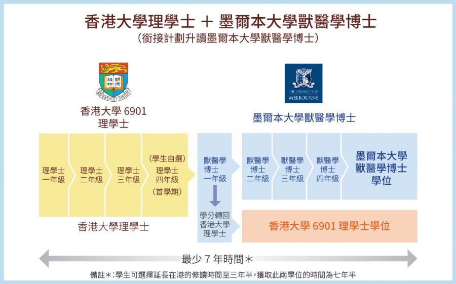 獲選的6901理學士學生在港大完成最少6個學期及修畢186學分後,可透過銜接計劃到墨爾本大學修讀首年獸醫學博士課程。在符合港大相關規則的前提下,學生在首年獸醫學博士課程所得的學分,可透過學分轉換方式,轉換為港大相關選修科目,以符合理學士的畢業要求。參與計劃的學生須用不少於7年時間完成課程,畢業生可獲頒兩個學位,分別是港大理學士及墨爾本大學獸醫學博士(見圖一)。此獸醫學博士課程為國際認可,學生畢業後合資格在多個國家成為執業獸醫,而毋須再接受其他培訓。畢業生亦可透過香港獸醫管理局登記成為註冊獸醫,在香港執業,為有意從事獸醫行業的優秀學生提供一個嶄新的升學途徑。