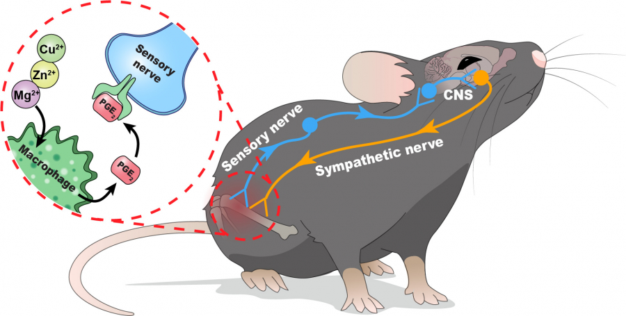 部分金屬離子如鎂離子、鋅離子和銅離子等二價正離子,已獲證明在骨組織再生中具有重要價值。然而由於我們對這些二價金屬正離子促進骨骼再生的具體分子細胞學機制瞭解不足,大大限制了其臨床應用。近年來,神經科學領域對內感受(interoception)研究興起,大量研究成果為中樞神經系統控制體內狀態提供了新認知。事實上,骨骼系統作為人體最大的器官,由大量感覺神經和交感神經與中樞神經系統互相連接;而感覺神經末梢分布在骨組織中,負責識別並傳送與疼痛、溫度和機械刺激有關的訊號。同時,位於下丘腦的部分核團通過調節交感神經來控制骨內穩態。然而,金屬離子通過骨內感受回路誘導骨組織再生的具體角色,目前尚未明確。