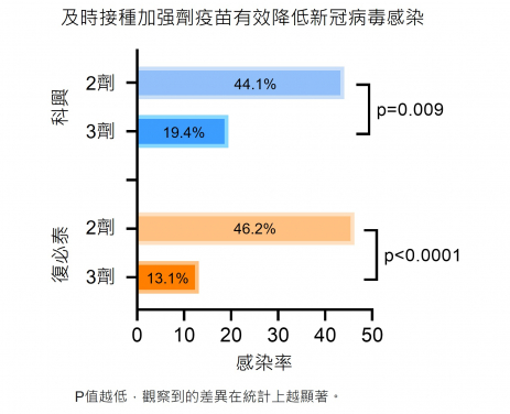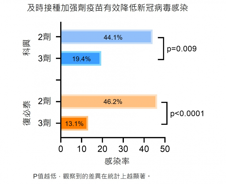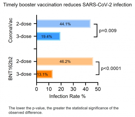 是項研究以470名接種了不同新冠疫苗的本地公職人員為基礎,調查了Omicron BA.2如何突破感染——他們在BA.2變種病毒襲港前接種了兩劑以上的復必泰或科興,在BA.2爆發期間,團隊研究了接種三劑疫苗後接種者的免疫抗體及細胞免疫反應,與BA.2感染及臨床特徵的關連。結果發現三劑疫苗比兩劑疫苗顯著降低了BA.2突破感染的機會(2×BNT 46.2%vs 3×BNT 13.1%,p<0.0001;2×Corv 44.1%vs 3×CoV 19.4%,p=0.003)。