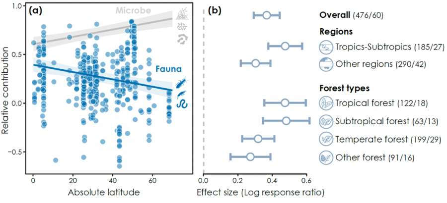 土壤無脊椎動物對森林凋落物降解的效應的區域模式。(a)無脊椎動物和微生物對森林凋落物降解的相對貢獻的緯度模式。(b)無脊椎動物效應在不同地區和森林類型中的總體估計。插圖擷取自《生態學快報》(Ecology Letters)的相關論文。