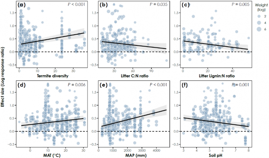 在這項研究中,Ashton教授的團隊分析了來自全球93個地點的476項案例,在此基礎上使用統合分析(Meta-analysis)的方法評估了森林生態系統中透過無脊椎動物進行凋落物降解的地區性差異。