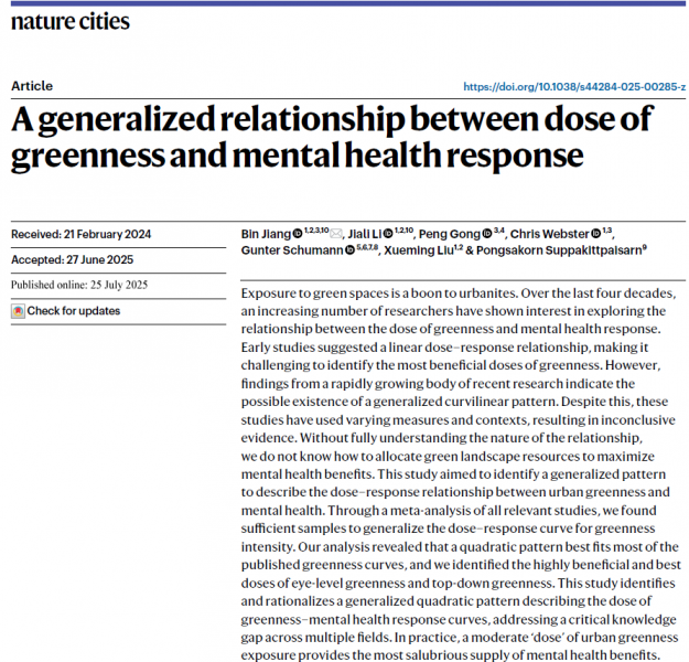 世界衛生組織估計,每八人中就有一人面臨嚴重心理健康問題,但僅有28%的人獲得治療。在此挑戰下,城市綠化作為一項極具潛力的公共衛生干預措施,正日益受到關注。數十年的研究證據表明,綠色環境有助於減輕壓力、焦慮和抑鬱,並提升注意力及認知表現。然而,不同情境與文化背景下的研究結果差異較大,這為城市規劃和設計制定可操作目標帶來了挑戰。「劑量-反應 (dose-response)」關係的具體形態一直未有定論,早期研究多認為其為線性關係,但近年來越來越多的研究指出,綠化與心理健康之間可能存在曲線型關係,即適度綠化可帶來最大益處。