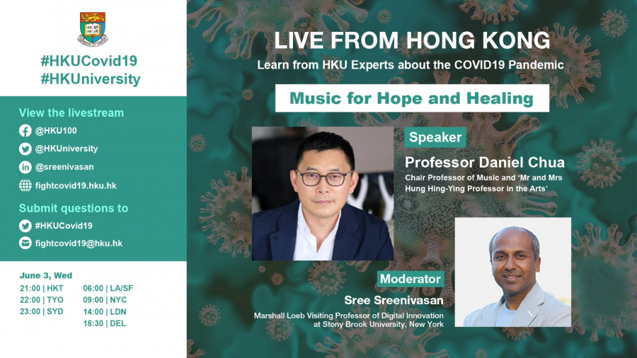 誠邀你參與香港大學音樂系主任蔡寬量(Daniel Chua)教授在線上直播的「港大抗疫」全球對話。蔡寬量教授將分享音樂如何帶來希望和治癒人心,並回答來自世界各地的問題。直播活動將於本週三 (6月3日)香港時間 晚上09:00舉行。我們將探討有關議題。直播將以英語進行。