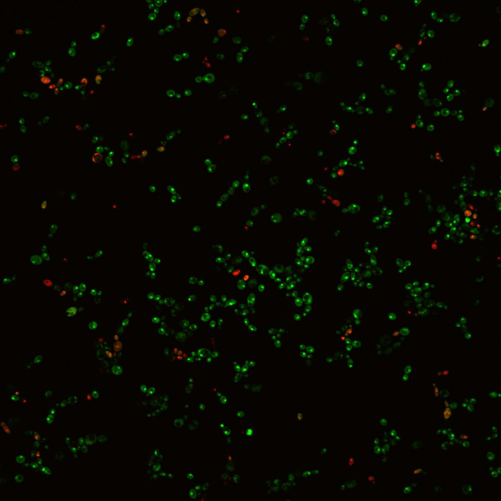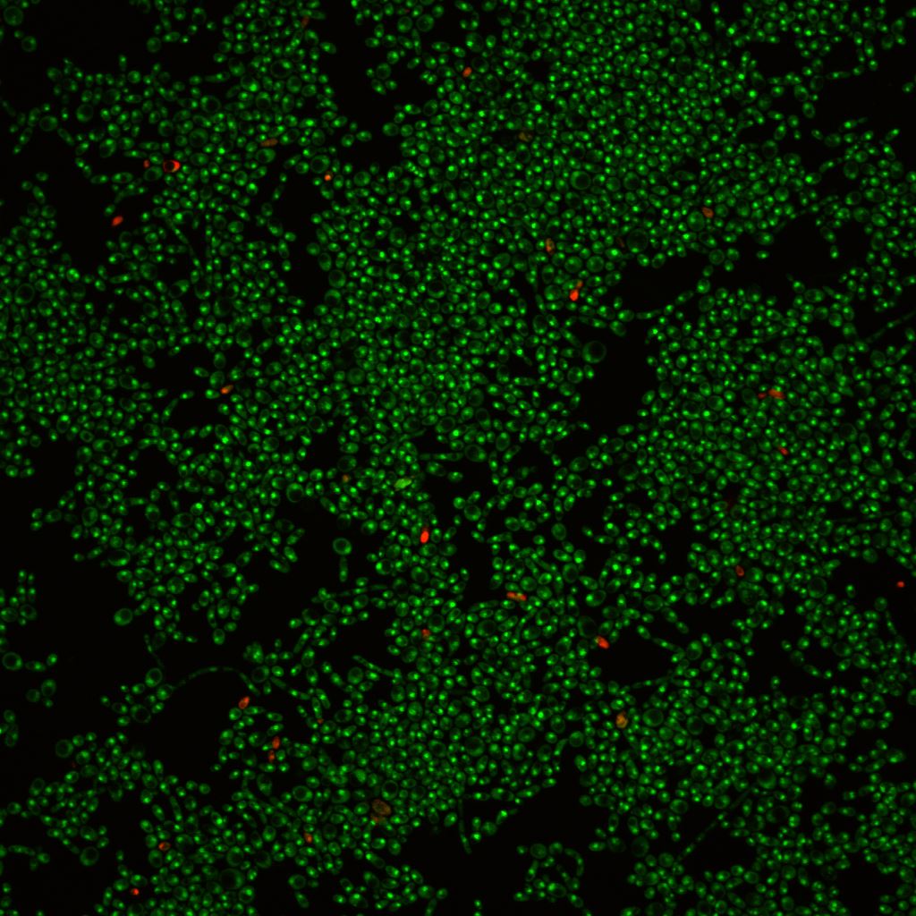Confocal laser scanning microscopy shows that C. albicans develops biofilms on a plastic surface (left photo), and addition of purpurin suppresses biofilm formation (right photo). Green cells are living and red cells are dead.