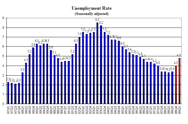 - The provisional seasonally adjusted unemployment rate worsened from 3.5% in the three months average ending in October 2008 to 3.8% for the three months ending in November 2008. The median of duration of unemployment rose to 72 days in Q3 of 2008 from 67 days in Q2 of 2008, reflecting a softening in the job market which is projected to worsen. The unemployment rate is forecast to be 4.0% in Q4 of 2008, and is projected to rise to 4.8% in the current quarter.