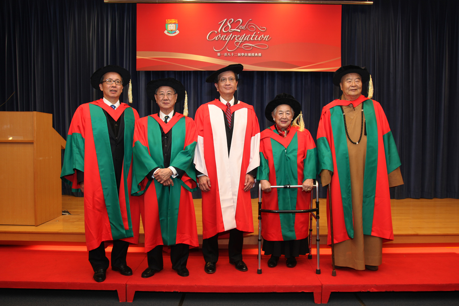 The five honorary degree recipients: Mr Lawrence Siu Por FUNG, Professor Richard Yue Hong YU, Professor Lawrence Chin Bong CHAN, Dr Serena Hsueh Chi YANG, The Venerable Master Hsing Yun