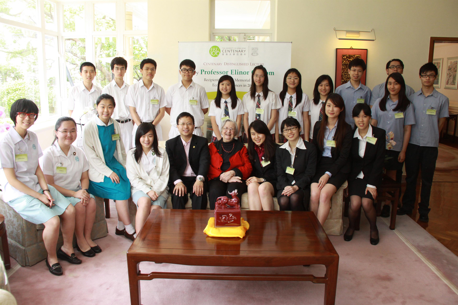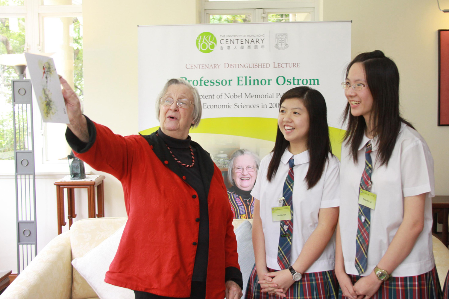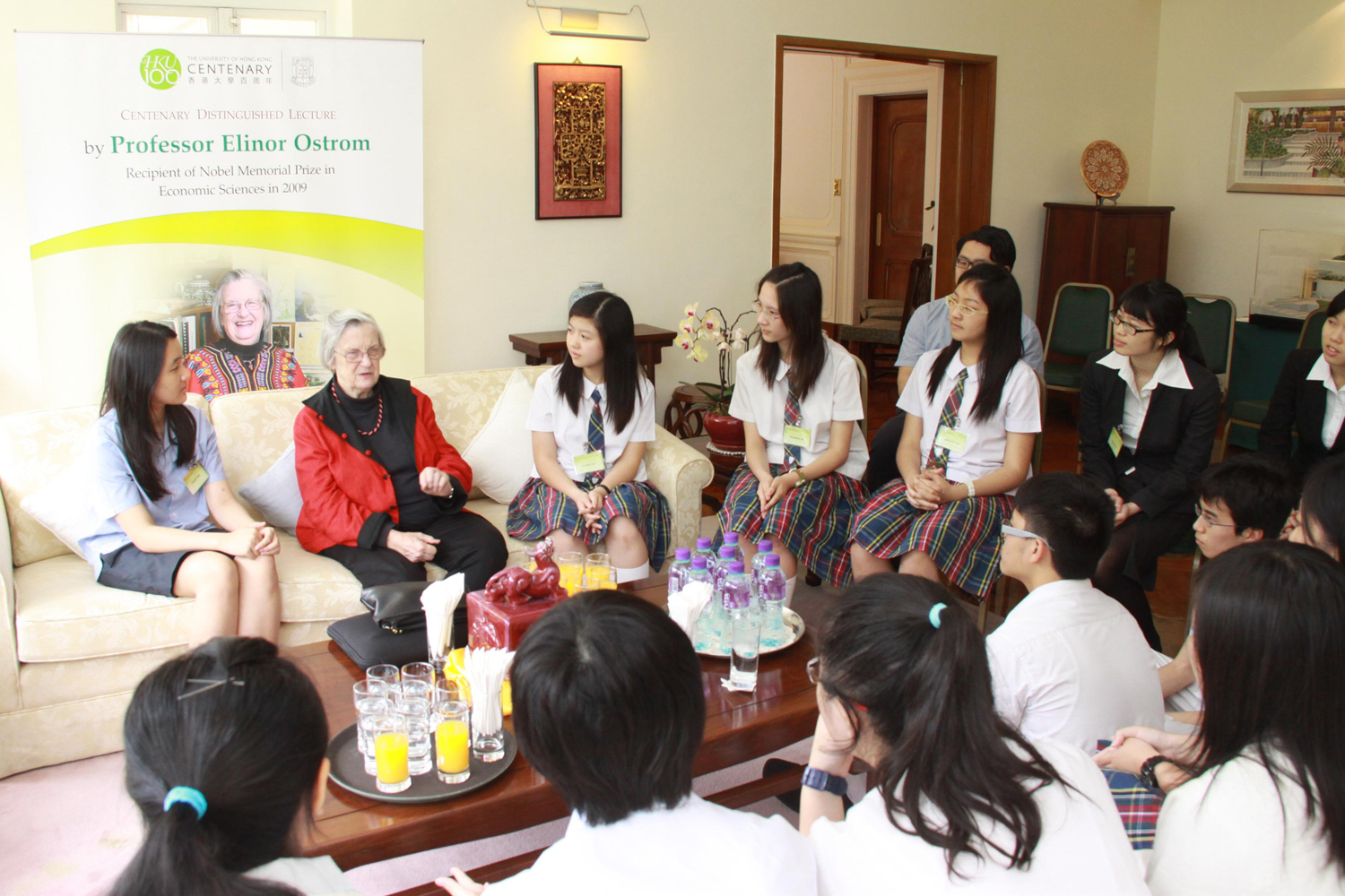 The lunch, which was held in the Vice-Chancellor's residence, the University Lodge, provided a rare opportunity for the young students to meet face-to-face with the Nobel Laureate beyond the classroom. In the two-hour dialogue, students and Professor Ostrom discussed various issues including her studies in economic governance and environmental protection. She also shared her working experiences, what motivated her in her research career as well as her hobbies.