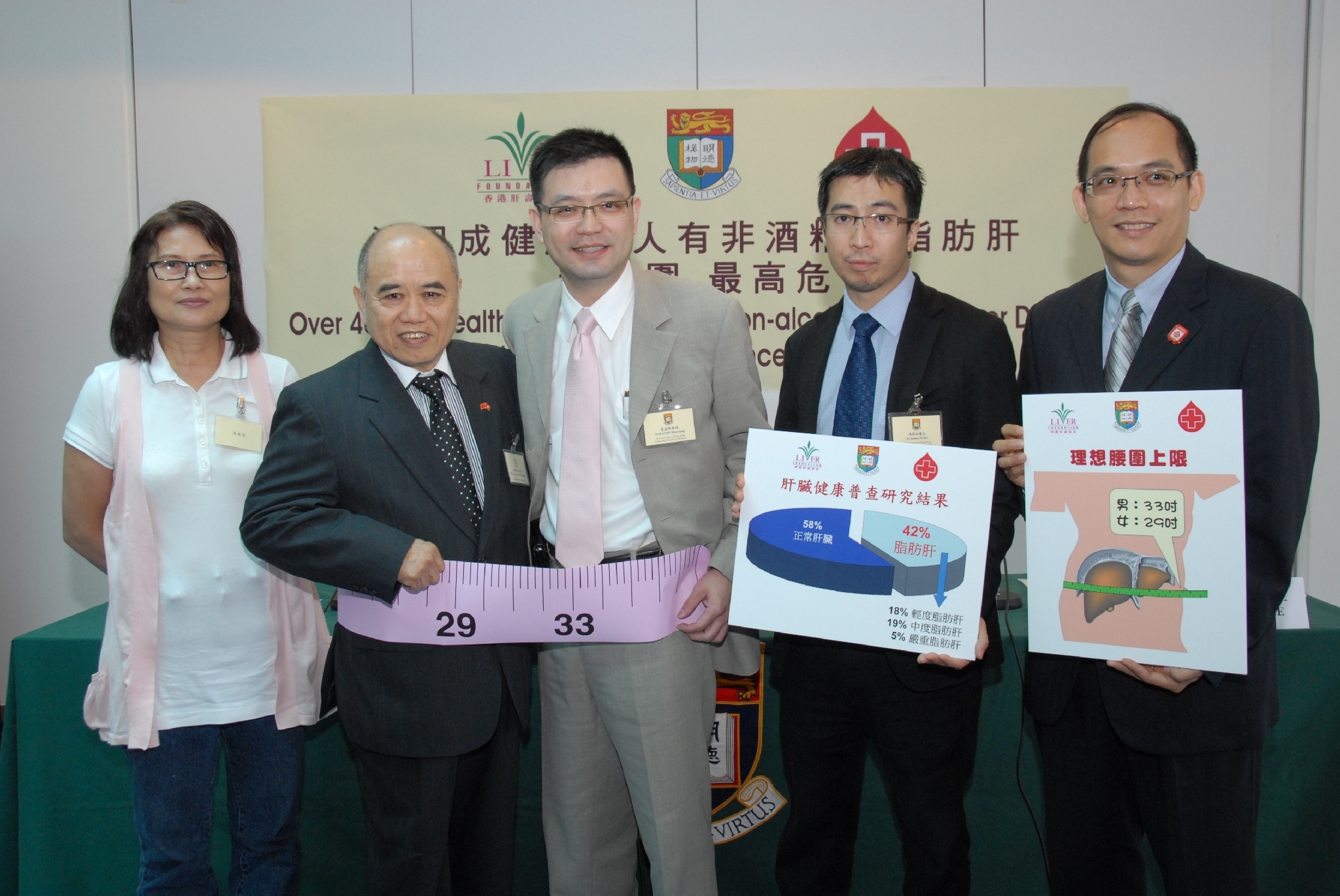 Fatty liver disease (the accumulation of fat inside the liver cells) may lead to cirrhosis and increase the risk of having liver cancer. Western medicine believes that drinking alcohol and hepatitis C infection are the major risk factors for fatty liver disease. However, healthy people without such risk factors will still have fatty liver, non-alcoholic fatty liver disease (NAFLD) refers. To find out the prevalence of NAFLD in Hong Kong and the associated risk factors, The University of Hong Kong Li Ka Shing Faculty of Medicine collaborates with Hong Kong Liver Foundation and Hong Kong Red Cross Blood Transfusion Service to conduct the first ever large population study on liver health named “The Liver Health Census Study”. Study results show that 42% of Hong Kong people have NAFLD and interestingly, higher waist circumference is the most important risk factor. It is also found that male and female with more than 33 inch and 29 inch waist circumference respectively have 5 times higher risk of developing NAFLD compared with those with waist circumference below these values.