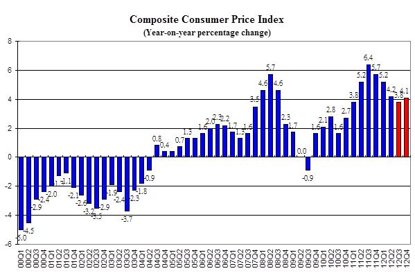 - The general price level, as measured by the Composite CPI, rose by 3.8% in August 2012. The headline consumer inflation rate was 4.2% in 12Q2. If there were no fiscal measures, the underlying rate would have been 5.1% in 12Q2. Inflationary pressure is projected to ease further, given the decelerating growth in food and rental prices. The inflation rate is forecast to be 3.8% in 12Q3 and increase to 4.1% in 12Q4. For the year as a whole, the headline consumer inflation is estimated to be 4.3% for the year of 2012, as compared to the 5.3% in 2011.