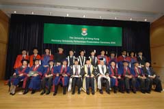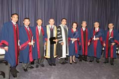 香港大學(港大)在今天(12月15日)舉行名譽大學院士銜頒授儀式,並由港大副校監李國寶博士主禮。 今年,港大向八位傑出人士頒發名譽大學院士銜,以表揚他們對大學及社會的貢獻。獲得名譽大學院士銜的人士包括陳曾燾博士、鍾健國先生、方潤華博士、劉秀成議員、李健鴻教授、伍沾德博士、胡應洲醫生及施玉榮夫人。[以下為各名譽大學院士之履歷] 在典禮上,港大校長<>徐立之教授表示,港大透過這個創立於一九九五年的榮譽,不但向那些對大學發展極為支持的人士表達謝意,更希望藉此加強及擴大港大與社會各界的聯繫。 徐教授最後讚揚各院士為社會及大學所作的貢獻,也為一輩樹立典範:「院士們為我們展示了模範公民的典型:以實際行動體現對教育的投入及熱誠,和對社會福的重視。」 新聞媒體如有任何查詢,請致電2859 2606與香港大學外務處張美娟小姐聯繫。 如欲參閱頒獎典禮之照片,可瀏覽港大網址傳媒頁中相片廊(Photo Gallery)的活動篇(Events) http://www.hku.hk/hkumedia/。 今年獲頒授名譽大學院士銜的八位傑出人士分別為: 陳曾燾博士 陳曾燾博士為傑出企業家及地產發展商,於1997年創立思源基金會,致力貢獻國家及香港的高等教育發展,1995年起出任香港大學教研發展基金創會名譽會長。陳博士於1948年在復旦大學畢業,並於1960年代來港發展,陳博士為恒隆集團創辦人之一,先後擔任該集團的董事、董事總經理及主席職位,至1990年止。他亦曾任基本法諮詢委員會委員、香港聯合交易所理事、證券及期貨事務監察委員會董事及香港中央結算有限公司主席,積極投入香港公共服務,對社會貢獻良多。 鍾健國先生 鍾健國先生為年青有為的工業家,積極推動內地、香港及國際間教育發展,多年來頒發數以百計的獎學金資助國內研究生前往英國諾定咸大學修讀,對國家經濟繁榮貢獻良多。鍾先生並致力鞏固非洲萊索托王國及國家的學術交流。鍾先生現為香港大學教研發展基金的名譽贊助人,不遺餘力推動港大的發展。他亦是萬都發展有限公司主席,房地產及投資業務遍及全國。 方潤華博士 方潤華博士是著名慈善家,現任協成行集團主席、方樹福堂基金主席及方潤華基金主席。方博士秉承其家族樂善好施的精神,不遺餘力促進內地及香港的教育發展,香港大學方樹泉文娛中心就是為紀念其父對港大的支持而成立。方博士多年來慷慨捐獻,在內地建成數十間學校,讓貧困的內地學童獲得教育機會。方博士善心廣布,備受香港及國際摧崇,除獲得多個國家及學術機構頒予名譽博士學位及名譽市民獎之外,香港政府亦向他授予銀紫荊星章,國際小行星委員會亦將其中一顆小行星以其名字命名。 劉秀成議員 劉秀成議員是著名建築學家,於1973年至2004年期間在香港大學建築系任教,並於1996至2000年出任建築系系主任,他亦是在任最長的大學權杖員。劉教授除熱衷教學外,亦參與許多建築設計比賽,屢獲獎項。劉教授為現任立法會議員,他亦擔任多項公職,包括香港貿易發展局基建發展諮詢委員會主席,以其專業回饋社會。2000年他獲政府頒授銀紫荊星章以表揚他對社會的貢獻。 李健鴻教授 李健鴻教授服務香港醫務委員會多年,是婦產科及公共衛生健康的先鋒,李教授精於研究胎兒毛病,並經常現身香港電台「醫生與你」的節目,向大眾講解醫學常識。李教授曾在港大婦產科學系任教,1998年起又擔任名譽臨床助理教授。李教授積極支持母校發展,並透過擔任畢業生議會常務委員會及校董會的成員,為大學的教研發展作出貢獻。 伍沾德博士 伍沾德博士為美心集團主席,在香港、內地及國際間致力傳揚中國飲食文化。伍博士於四十年代在廣州嶺南大學畢業,多年來,致力推動香港及內地的高等教育發展,在他積極勸說之下,國家教育委員會於1988年重新成立廣州中山大學之嶺南(大學)學院。他現時為該院的發展及計劃委員會主席及其信託委員會的名譽主席,致力培育南中國專業管理人才。伍博士亦是美國麻省春田大學及廣州中山大學的名譽博士,2001年獲香港政府頒授銀紫荊星章。 胡應洲醫生 胡應洲醫生生於慈善之家,其父為胡忠先生,兄弟胡文瀚、胡應湘、胡應濱均積極為公眾服務。胡醫生早年在美攻讀,是心臟科專家,現任哥倫比亞大學信託人執行委員會兼健康科學委員會的委員。胡醫生雖然長期留美發展,他對港大醫學教育發展十分關心,多年來透過家族支持大學成立多項研究基金,成立訪問學人教席及獎學金等,以促進港大與內地及美國的醫學院和大學,開展研究合作。 施玉榮夫人 施玉榮夫人植根香港,其家族與港大淵緣深厚,父親為港大名譽博士羅旭和爵士,丈夫為馬禮遜堂宿生已故施玉榮先生,施玉榮夫人秉承兩個家族樂善好施的傳統,對香港及香港大學的發展作出了重大的貢獻。為紀念施玉榮先生而成立的施玉榮基金,致力推動教學及科研工作,於2002年在香港大學成立施玉榮心臟專科中心,於2005年資助矯型及創傷外科學系的研究項目。 圖片說明: 圖片1: 左起:劉秀成議員、鍾健國先生、陳曾燾博士、港大副校監李國寶博士、港大校長徐立之教授、施玉榮夫人、方潤華博士、伍沾德博士及李健鴻教授(胡應洲醫生未能出席今天典禮) 圖片2二: 陳曾燾博士、鍾健國先生、方潤華博士、劉秀成議員、李健鴻教授、伍沾德博士、施玉榮夫人、港大副校監李國寶博士、港大校長徐