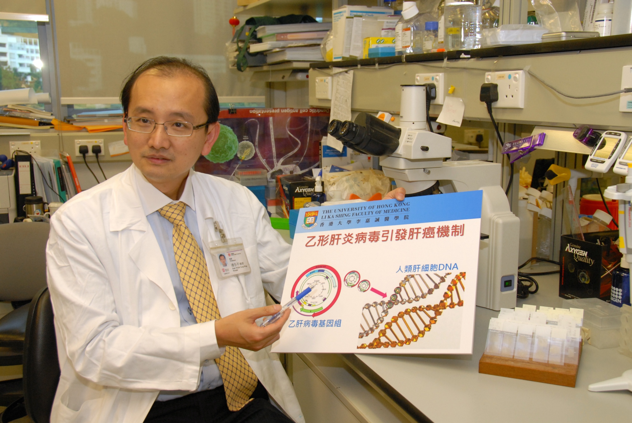 乙型肝炎(乙肝)病毒感染是一個世界性的健康問題。根據世界衞生組織的統計,全球有超過3.5億名乙肝帶菌者。乙肝帶菌者患肝癌的機會率是非帶菌者的一百倍,但是乙肝病毒究竟如何引發肝癌則一直未明。香港大學李嘉誠醫學院外科學系最近進行了全球首個以全基因方法分析乙肝病毒基因融入肝癌細胞基因的研究,揭示了乙肝病毒與人類基因結合、從而引發肝癌的機制。研究發現,在肝癌組織中,乙肝病毒基因與人類基因的結合明顯較在癌旁肝組織中為多(86.4%對30.7%)。研究人員成功識別出乙肝病毒基因組的「裂口」--透過這個「裂口」,病毒基因得以與人類基因結合。同時,研究人員發現最常與乙肝病毒基因結合的三個人類基因。這些突破性的發現,相信有助研製預防肝癌的藥物。有關研究成果最近已於基因學研究範疇的頂尖期刊《自然—基因學》(Nature Genetics)上發表。