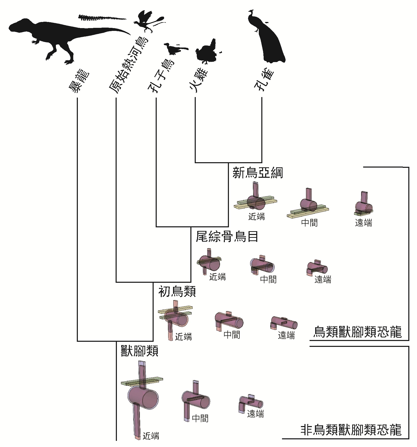此圖為原始鳥類脊椎形態演化的復原圖。結果根據尾巴關節的柔韌度的變化作復原標準。當中包括獸腳類恐龍至現代雀鳥尾巴近端、中間和遠端的模型。獸腳類恐龍的輪廓(黑影)上的輪廓為其尾巴骨架。(相片由 文嘉祺博士 及其研究小組提供)