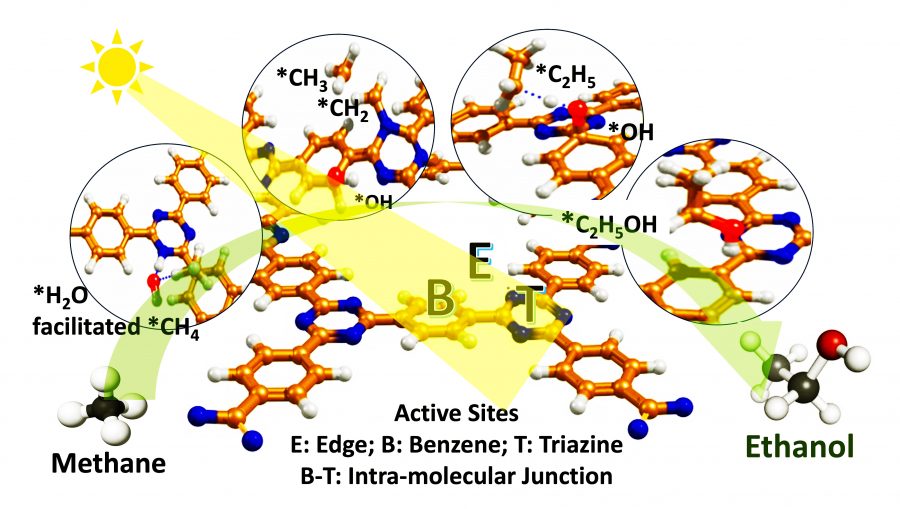 研究團隊研發的這項新技術利用一種名為「共價三嗪框架聚合物」(CTF-1)的材料,其分子內質結能實現高效轉換、有效地分離電荷並延長其壽命。此結構同時讓氧氣和水分別吸附在單元上,從而促進兩個碳化學鍵的結合。此外,這種不對稱雙活性位點設計能夠將該化學鍵結合與羥基自由基生成的位點分開,避免中間產物過度氧化為二氧化碳和水。當加入鉑作為助催化劑後,乙醇的產量可進一步提升到更高的水平。
